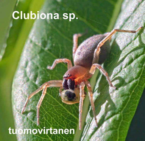 Clubiona sp. Clubionidae-Pussihämähäkit, 26.6.2014. Heritynniemi Valkeakoski. Määritys jää sukutasolle.